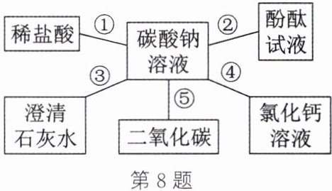 $8. $以碳酸钠溶液为例的反应关系$($如图$)$体现了盐类物质的化学性质,结合关系图回答下列问题。