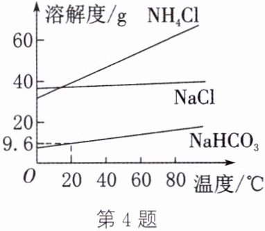 答案:4. B 解析:由图示可知,$0° C$时,$\mathrm{NH_4Cl}$的溶解度小于$\mathrm{NaCl}$的溶解度,A 不正确。$\mathrm{NH_4Cl}$的溶解度受温度影响较大,$\mathrm{NaCl}$的溶解度受温度影响较小,故$\mathrm{NH_4Cl}$溶液中含有少量$\mathrm{NaCl}$,可用降温结晶的方法提纯$\mathrm{NH_4Cl}$,B 正确。$20° C$时,碳酸氢钠的溶解度为$9.6\ \mathrm{g}$,即该温度下$100\ \mathrm{g}$水中最多可溶解碳酸氢钠的质量为$9.6\ \mathrm{g}$,将$9.6\ \mathrm{g}\ \mathrm{NaHCO_3}$加入$90.4\ \mathrm{g}$水中,$9.6\ \mathrm{g}$碳酸氢钠不能完全溶解,得不到$100\ \mathrm{g}$饱和溶液,C 不正确。$20° C$时,$\mathrm{NaHCO_3}$的溶解度小于$\mathrm{NH_4Cl}$的溶解度,则$20° C$时,$\mathrm{NaHCO_3}$饱和溶液的溶质质量分数小于$\mathrm{NH_4Cl}$饱和溶液的溶质质量分数,但选项中未指明溶液的状态,所以无法比较两种溶液的溶质质量分数的大小,D 不正确。