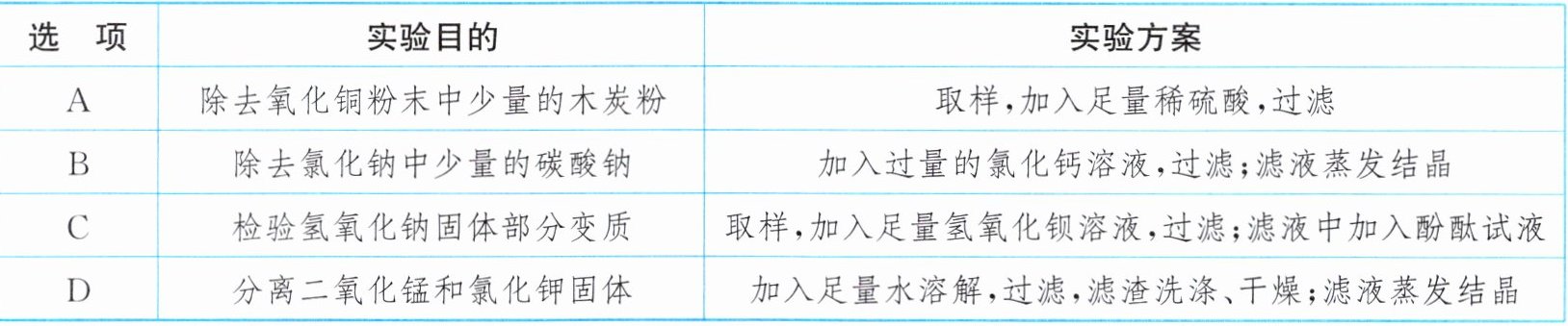 )答案:13. D 解析:氧化铜能与稀硫酸反应生成硫酸铜和水,会将主要物质除去,A 不能达到实验目的。碳酸钠能与氯化钙溶液反应生成碳酸钙沉淀和氯化钠,能除去杂质但引入了新的杂质氯化钙(过量的),不符合除杂原则,B 不能达到实验目的。变质后的氢氧化钠中含有碳酸钠,取样,加入足量氢氧化钡溶液,碳酸钠和氢氧化钡反应生成碳酸钡沉淀和氢氧化钠,由于有氢氧化钠生成,因此不能检验氢氧化钠固体是部分变质还是全部变质,C 不能达到实验目的。$\mathrm{KCl}$易溶于水,$\mathrm{MnO_2}$难溶于水,可加入足量水溶解,过滤,滤渣洗涤、干燥,分离出二氧化锰;对滤液蒸发结晶,再分离出氯化钾,D 能达到实验目的。