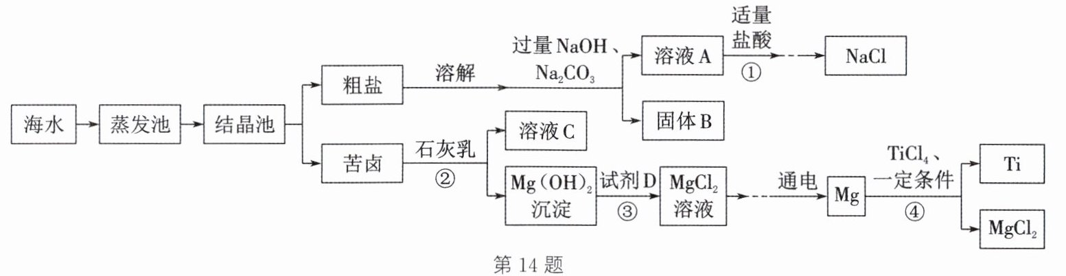 。答案:14. (1)$\mathrm{Mg(OH)_2}$ (2)除去过量的氢氧化钠和碳酸钠