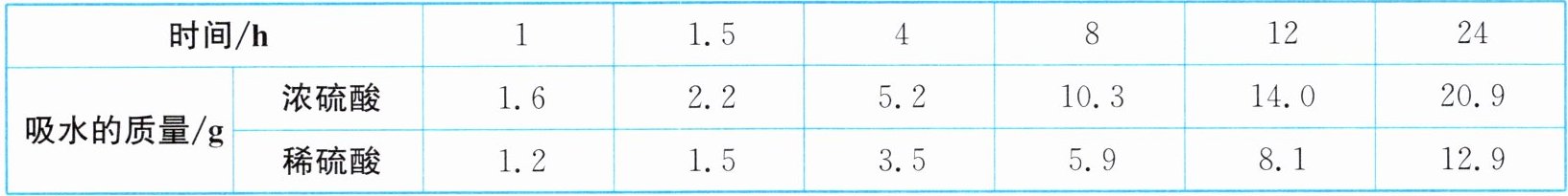 11. 向两个烧杯中分别注入浓硫酸(溶质的质量分数为98%,$ρ=1.84 g/cm^{3}$)和稀硫酸(浓硫酸与水的体积比为1 : 1)各10 mL,称量并记录不同时间两种硫酸溶液吸水的质量,数据如表所示。