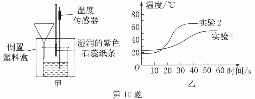10.(数字化实验)探究浓硫酸稀释操作中浓硫酸和水的注入顺序对实验的影响,实验装置如图甲,两个实验分别测得的温度变化如图乙。沿漏斗缓慢加入等量液体后,观察到实验2中湿润的紫色石蕊纸条比实验1有更多红色斑点。下列有关分析不合理的是 (