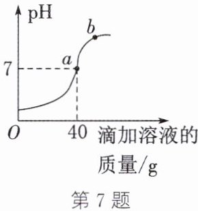 7.(2024·宿迁)化学实践小组为测定实验室一瓶失去标签的稀盐酸的溶质质量分数,取该稀盐酸 $50\ g$,利用传感器实时监测稀盐酸与溶质质量分数为 $10\%$ 的氢氧化钠溶液反应过程中 $ p H$ 的变化情况,测定结果如图所示。