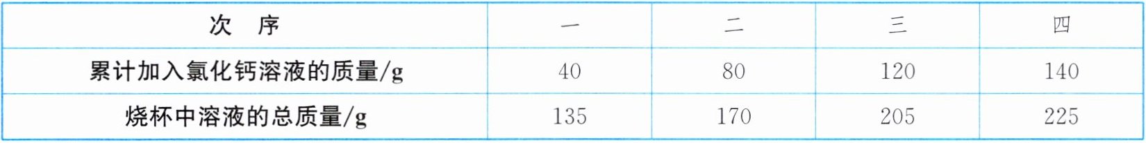 8. 实验室用碳酸钠溶液与氯化钙溶液反应制取高纯度碳酸钙粉末,烧杯中现有 $100\ g$ 碳酸钠溶液,将 $140\ g$ 氯化钙溶液分四次加入,充分反应。四次测量所得数据如表所示: