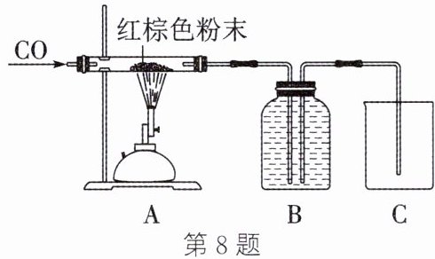 答案:8. (1) 将装置内空气排尽,防止加热时发生爆炸 (2) 红棕色粉末逐渐变为黑色$ Fe₂O₃+3CO\overset{高温}{=}2Fe+3CO₂ $还原剂 (3) A