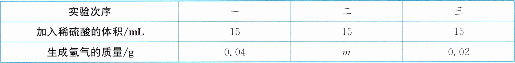 解析:(1) 由表中数据可知,第一次加入15mL稀硫酸生成0.04g氢气,第三次加入15mL稀硫酸仍有氢气生成且只生成了0.02g,这就说明直到第三次实验锌才反应完全,并且硫酸有剩余;所以第二次加入15mL稀硫酸时硫酸完全反应,生成氢气的质量仍为0.04g,故m的数值为0.04。(2) 黄铜是铜锌合金,加入稀硫酸,铜不与硫酸反应,锌与硫酸反应生成硫酸锌和氢气,由(1)的分析可知,第三次加入15mL稀硫酸,锌反应完全,且硫酸有剩余,所以第三次实验结束后,烧杯中所得溶液的溶质为生成的硫酸锌和剩余的硫酸。