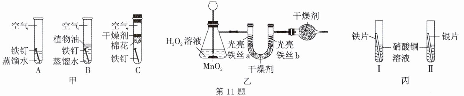 $ t$。答案:11. (1) B (2) ① AB ② 铁丝a生锈,铁丝b不生锈 ③ 氧气的浓度较大(合理答案均可) (3) ① Fe+Cu(NO₃)₂=Fe(NO₃)₂+Cu ② 硫酸亚铁溶液 硝酸银溶液(合理答案均可) (4) 48500 解析:(4) 该厂每月生产的生铁中含铁元素的质量为28000t×97%=27160t。设该厂每月至少需消耗含氧化铁80%的赤铁矿石的质量为x。