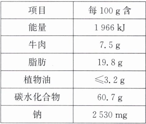 解析:(1) 牛肉富含蛋白质,植物油与脂肪属于油脂,碳水化合物属于糖类,钠属于无机盐,则该方便面中共有四种营养物质,还缺少维生素和水,故应补充蔬菜或水果。 (2) 人体缺碘可引起甲状腺肿大。 (3) 淀粉在人体内可以转化成葡萄糖,其转化过程需要淀粉酶催化。 (4) 食盐的主要成分是氯化钠,摄入该方便面100 g 相当于食用 Na 的质量为 2530 mg=2.53 g,则 NaCl 的质量为$\frac {2.53 g} {\frac {23} {58.5} × 100\%} \approx 6.4 g$。