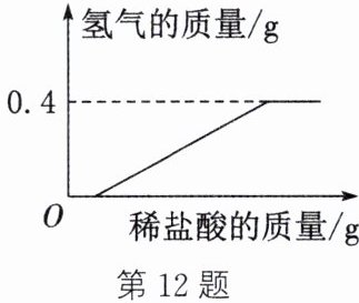 答案:12. (1) 0.4 g (2) 铝片表面的氧化铝先与稀盐酸反应,没有氢气产生(或 $\mathrm{Al_2O_3 + 6HCl \xlongequal\ 2AlCl_3 + 3H_2O}$) (3) 解:设该铝片中铝的质量为$x$。