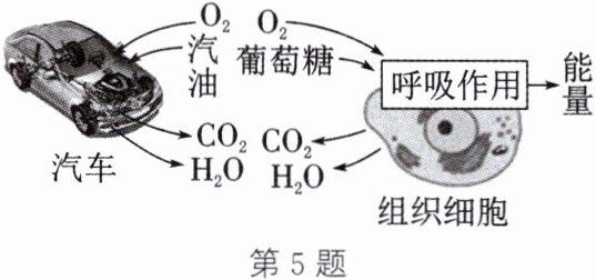 5. (跨学科融合)汽车开动和人的生命活动都需要能量,能量是各种运动的量度。给汽车开动和人的生命活动提供能量的两个过程如图所示,下列分析错误的是 (