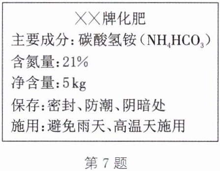。答案:7. (1)氮肥 (2)能 (3)存在 (4)防止铁铲生锈 解析:(1)该化肥中只含有营养元素中的氮元素,属于氮肥。(2)通过标签内容中的“防潮”可知,该肥料能溶于水。(3)碳酸氢铵中氮元素的质量分数为$\frac{14}{14+1×5+12+16×3}×100\%\approx17.7\%$,所以该化肥标签存在虚假宣传现象。