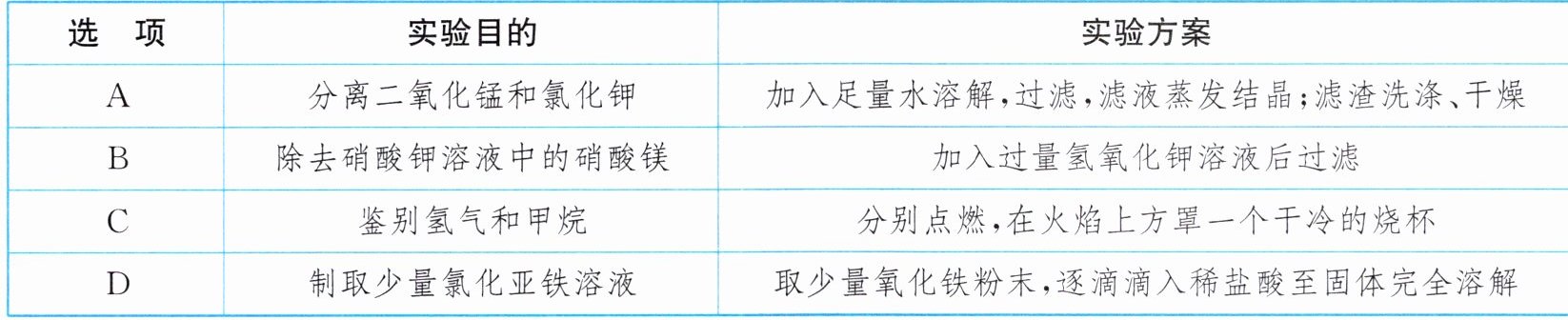 )答案:8.A 解析:氯化钾易溶于水,二氧化锰难溶于水,向固体中加入足量水溶解、过滤,将滤液蒸发结晶得到氯化钾,将滤渣洗涤、干燥得到二氧化锰,能够达到实验目的;向混合溶液中加入过量氢氧化钾溶液后,氢氧化钾与硝酸镁反应生成氢氧化镁沉淀和硝酸钾,充分反应后过滤,除去了硝酸镁,但引入了新的杂质氢氧化钾,不能达到实验目的;氢气和甲烷燃烧都生成水,分别点燃,在火焰上方均罩一个干冷的烧杯,都会有水雾出现,现象相同,不能达到实验目的;氧化铁与稀盐酸反应生成氯化铁和水,此反应不能得到氯化亚铁溶液,不能达到实验目的。故本题选A。