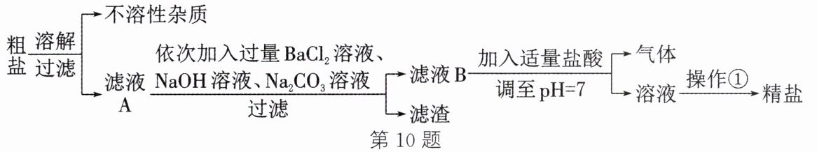 10. 从海水中得到的粗盐中往往含有可溶性杂质(主要有$Na_{2}SO_{4}$、$MgCl_{2}$、$CaCl_{2}$)和不溶性杂质(泥沙等),必须进行分离和提纯后才能使用。粗盐提纯的部分流程如图所示,回答下列问题: