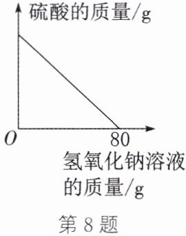 8. (2024·毕节模拟)某硫酸厂欲测定排放的废水中硫酸的质量分数(假设废水中只含硫酸一种溶质),取$200 g$废水样品,逐滴加入溶质质量分数为$5\%$的氢氧化钠溶液,废水中硫酸的质量随加入氢氧化钠溶液的质量变化如图所示。