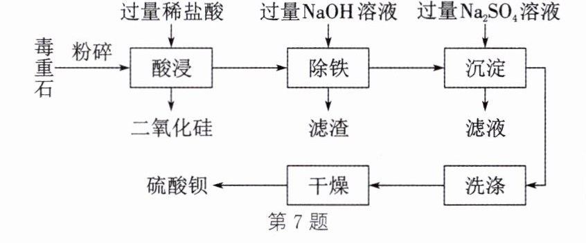 7. (2024·武汉)硫酸钡是白色固体,医疗上常用作透视肠胃的内服剂。以毒重石(主要成分是碳酸钡,还含少量氧化铁和二氧化硅)为原料生产硫酸钡的工艺流程如图所示。回答下列问题: