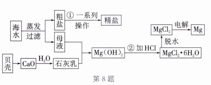 。答案:8.(1)蒸发 (2)使杂质完全反应 碳酸钠(或$\mathrm{Na}_{2}\mathrm{CO}_{3}$) 氢氧化钡[或$\mathrm{Ba(OH)}_{2}$] (3)B (4)C (5)石灰乳中的氢氧化钙含量高,能够消耗更多的氯化镁