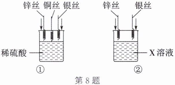 。答案:8.(1)大 (2)比较硬度 (3)Zn (4)①银丝、铜丝表面无明显现象,锌丝表面有气泡产生 ②锌丝表面有红色物质析出,银丝表面无明显现象 (5)银丝和硝酸铜溶液(合理答案均可) (6)Zn+H₂SO₄=ZnSO₄+H₂↑ (7)回收和利用废旧金属(合理答案均可)