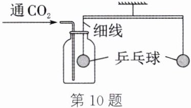 10. (跨学科融合)如图,杠杆已调至水平平衡。向集气瓶内缓慢通入一定量的$CO_2$气体,稍后倒入浓$NaOH$溶液(液面不接触乒乓球)。下列说法正确的是