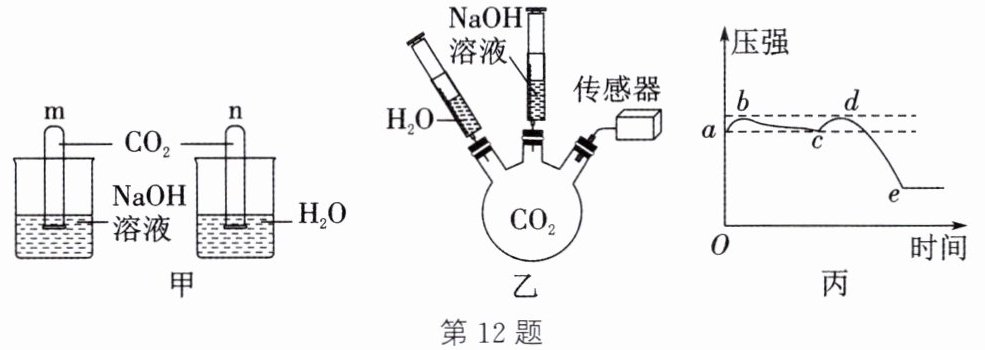 12. 如图,用甲、乙两实验证明$CO_2$能与$NaOH$反应。(通常状况下,1体积水约能溶解1体积$CO_2$)