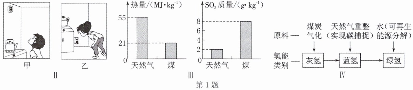 【任务2】理解燃料变化的意义。充分燃烧1 kg天然气或煤释放的热量和产生$SO_2$的质量如图Ⅲ。