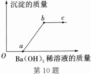 答案:10. C 解析:某溶液中的溶质可能含有HCl、$Na_2CO_3$、$H_2SO_4$、$MgCl_2$中的一种或几种。向盛有一定量样品的烧杯中逐滴加入$Ba(OH)_2$稀溶液,由图示可知,加入一定量氢氧化钡稀溶液之后才有沉淀产生,说明溶液中一定有盐酸,一定没有硫酸,因为盐酸与氢氧化钡反应生成氯化钡和水,一开始不会出现沉淀,而硫酸与氢氧化钡反应生成硫酸钡沉淀和水,一开始就会有沉淀产生;盐酸和碳酸钠不能共存,有盐酸存在,则一定没有碳酸钠;盐酸反应完后,氯化镁和氢氧化钡反应生成氢氧化镁沉淀和氯化钡,开始有沉淀产生,氯化镁反应完后沉淀质量不再改变,故原溶液中一定有氯化镁。由上述分析可知,原溶液中一定没有$H_2SO_4$、$Na_2CO_3$,A选项说法错误。b点时氯化镁和氢氧化钡恰好完全反应,产生的沉淀为$Mg(OH)_2$,B选项说法错误。a、b两点之间的反应是氯化镁和氢氧化钡反应生成氢氧化镁沉淀和氯化钡,对应烧杯内溶液中的溶质有反应生成的氯化钡和未反应完的氯化镁两种,C选项说法正确。c点时氢氧化钡已过量,对应烧杯内溶液中的溶质有生成的氯化钡和过量的氢氧化钡两种,D选项说法错误。