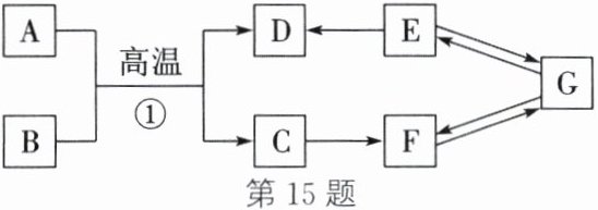 15. (6 分)学习化学需要熟悉物质的性质、用途及物质之间的相互转化关系。如图所示,A~G 均为初中化学常见的物质,其中 A、D、E、F 是气体且 A、D 组成元素相同,B 是红棕色固体,G 是生活中最常用的液体溶剂(“→”