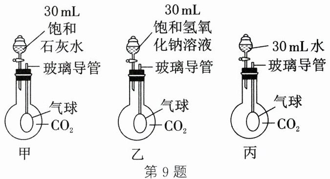 9. 如图所示,甲、乙、丙三个烧瓶的容积均为250 mL,且充满$ CO_2$。将分液漏斗中的液体同时全部注入三个烧