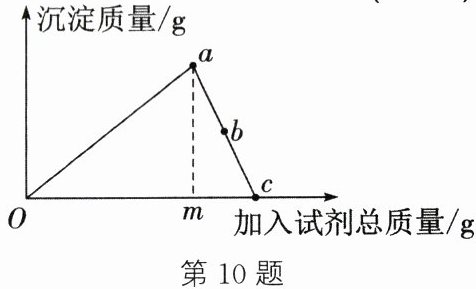 答案:10.A 解析:向盛有CuSO₄溶液的烧杯中先后滴入NaOH溶液和稀硫酸,硫酸铜和氢氧化钠反应生成氢氧化铜沉淀和硫酸钠,氢氧化铜与硫酸反应生成硫酸铜和水,a点时沉淀质量最大,且随后沉淀质量直接开始减小,说明a点之后开始加入稀硫酸,由于不确定硫酸铜是否完全反应,因此此时硫酸铜可能有剩余,则溶液可能显蓝色,A错误。氢氧化铜沉淀与稀硫酸反应生成硫酸铜和水,沉淀的质量逐渐减小,b点时所加试剂为稀硫酸,溶液中的溶质一定有硫酸钠,还含有氢氧化铜和硫酸反应生成的硫酸铜,B正确。c点时溶液中的溶质为硫酸钠、硫酸铜,根据元素守恒定律可知,c点时溶液中CuSO₄的量与最初烧杯中CuSO₄的量一样多,C正确。加入试剂总质量为mg时,沉淀最多,随即加入稀硫酸,沉淀立即减少,说明加入的氢氧化钠没有过量,溶液中肯定不存在NaOH,D正确。