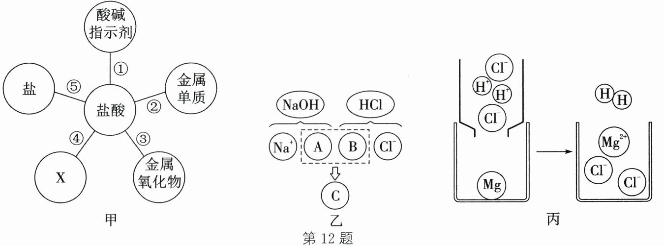 (填微观粒子符号)。答案:12.(1)红 (2)碱 (3)Fe₂O₃+6HCl=2FeCl₃+3H₂O (4)OH⁻、H⁺、H₂O (5)Mg、H⁺ 解析:(1)紫色石蕊试液遇酸变红,盐酸显酸性,故将紫色石蕊试液滴加到盐酸中,溶液变为红色。(2)酸的通性:与酸碱指示剂作用,使酸碱指示剂变色;与活泼金属反应生成盐和氢气;与金属氧化物反应生成盐和水;与碱反应生成盐和水;与盐反应生成新盐和新酸。根据图甲和以上分析可知,X应为碱。(3)铁锈的主要成分为Fe₂O₃,Fe₂O₃和盐酸反应生成氯化铁和水,反应的化学方程式为Fe₂O₃+6HCl=2FeCl₃+3H₂O。(4)图乙描述了氢氧化钠溶液与盐酸反应(NaOH+HCl=NaCl+H₂O)的微观实质;氢氧化钠解离出钠离子、氢氧根离子,氯化氢解离出氢离子、氯离子,该反应的实质是氢氧根离子和氢离子结合生成水分子,故A、B、C处应填入的化学式或离子符号依次为OH⁻、H⁺、H₂O。(5)镁与盐酸反应生成氯化镁和氢气,即Mg+2HCl=MgCl₂+H₂↑,从微观角度看,反应前存在镁原子、氢离子和氯离子,反应后变为镁离子、氯离子和氢分子,所以该反应有效相互作用的微观粒子是镁原子和氢离子,符号为Mg、H⁺。