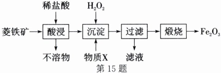 15. (6分)铁红($\mathrm{Fe_2O_3}$)可用于制备红色颜料,以菱铁矿(主要成分为$\mathrm{FeCO_3}$)为原料制备铁红的一种流程如图所示: