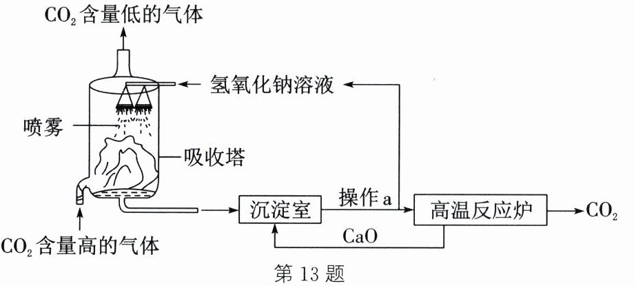 (填化学式)。答案:13.(1)温室效应 (2)增大反应物间的接触面积,提高二氧化碳的吸收率 (3)引流 (4)CaO+H₂O=Ca(OH)₂[或Na₂CO₃+Ca(OH)₂=CaCO₃↓+2NaOH] (5)NaOH