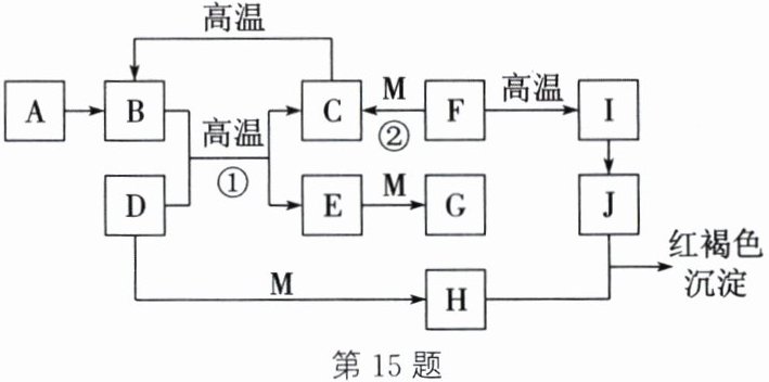 。答案:15. (1)CaCO₃ Fe³⁺ (2)复分解反应 (3)3CO+Fe₂O₃\高温=2Fe+3CO₂ (4)固体逐渐溶解,有气泡产生,溶液由无色逐渐变为浅绿色 解析:根据题目信息,D为红棕色粉末,则D是氧化铁;B能与氧化铁反应且有毒,则B为一氧化碳;氧化铁与一氧化碳在高温的条件下反应生成二氧化碳和铁,C能转化为一氧化碳,则C为二氧化碳,E为铁;A、B、C均含同一种元素,且A为单质,则A可以是碳或氧气;I俗称生石灰,则I为氧化钙;F在高温的条件下会生成氧化钙,则F是碳酸钙;碳酸钙与酸反应生成二氧化碳,因此M可以是盐酸;氧化铁与盐酸反应会生成氯化铁,则H可以是氯化铁;铁与盐酸反应会生成氯化亚铁,所以G可以是氯化亚铁;H与J反应生成红褐色沉淀(氢氧化铁),且I能转化为J,则J为氢氧化钙。代入图中验证,推断合理。(1)根据推断可知,F是碳酸钙,其化学式为CaCO₃,H溶液中的金属阳离子为铁离子(Fe³⁺)。(2)反应②是碳酸钙与酸的反应,该反应属于复分解反应。(3)B为一氧化碳,D为氧化铁,C为二氧化碳,E为铁,因此反应①为一氧化碳和氧化铁在高温的条件下反应生成铁和二氧化碳,该反应的化学方程式为3CO+Fe₂O₃\高温=2Fe+3CO₂。(4)E为铁,M可以为盐酸,铁与盐酸反应生成氢气和氯化亚铁(G),该反应的实验现象为固体逐渐溶解,有气泡产生,溶液由无色逐渐变为浅绿色。