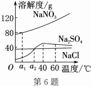 小,所以更适合通过饱和溶液蒸发结晶得到,A错误;$a_1$℃时,$\mathrm{NaNO_3}$的溶解度是80g,所以$a_1$℃时$\mathrm{NaNO_3}$的饱和溶液中溶质的质量分数为$\frac{80g}{80g + 100g} × 100\% \neq 80\%$,B错误;$a_2$℃时,$\mathrm{NaCl}$和$\mathrm{Na_2SO_4}$的溶解度相等,所以该温度下,两种物质的饱和溶液的溶质质量分数也相等,C正确;将40℃时$\mathrm{Na_2SO_4}$的饱和溶液升温到60℃,由于此过程中$\mathrm{Na_2SO_4}$的溶解度减小,因此所得溶液仍为饱和溶液,D错误。