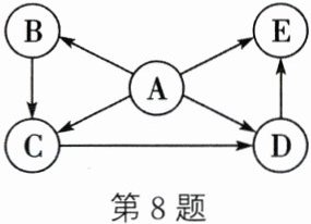 答案:8.D 解析:B俗称纯碱,则B是碳酸钠;C是大理石的主要成分,则C是碳酸钙,碳酸钠和氢氧化钙反应生成碳酸钙沉淀和氢氧化钠;A通常为气体,且A可以反应生成碳酸钙和碳酸钠,因此A是二氧化碳;E是一种单质,A~E是初中化学常见的物质且都含有一种相同元素,二氧化碳通过光合作用可以转化成氧气,故E是氧气;A、C都可以反应生成D,D可以反应生成氧气,故D是水,二氧化碳与氢氧化钙反应生成碳酸钙沉淀和水,碳酸钙与盐酸反应生成氯化钙、水和二氧化碳,水在通电条件下分解生成氢气和氧气;代入框图,验证合理。根据以上分析,E为氧气,化学式为$\mathrm{O_2}$,A正确;D是水,E为氧气,可以相互转化,B正确;A是二氧化碳,E为氧气,A→E可通过光合作用来实现,C正确;中和反应是酸和碱作用生成盐和水的反应,B是碳酸钠,C是碳酸钙,B→C的反应中反应物$\mathrm{Na_2CO_3}$属于盐,因此B→C不属于中和反应,D错误。