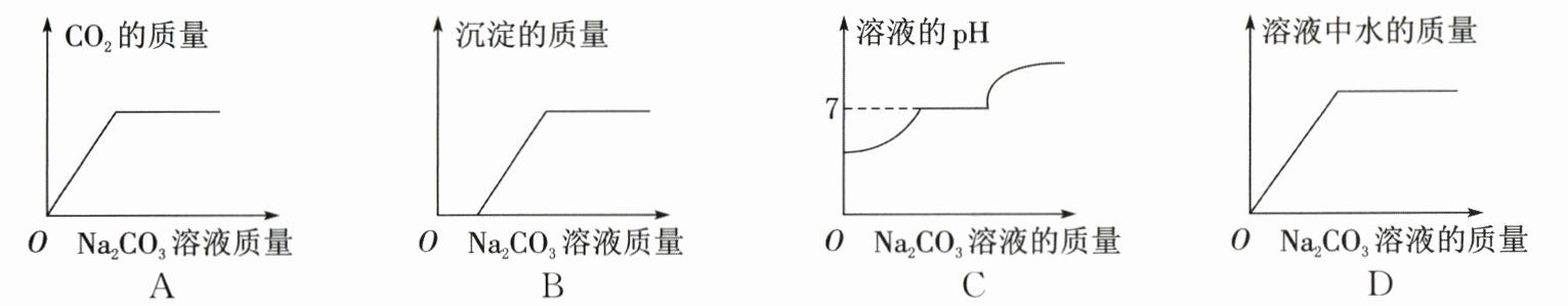 )答案:10.D 解析:向一定量盐酸和氯化钡的混合溶液中,逐滴滴加碳酸钠溶液至过量,碳酸钠先与盐酸反应生成氯化钠、水和二氧化碳,待盐酸完全反应后,氯化钡和碳酸钠反应生成碳酸钡沉淀和氯化钠,故生成二氧化碳的质量逐渐增大,待盐酸完全反应后,不再发生变化,A正确。碳酸钠先与盐酸反应生成氯化钠、水和二氧化碳,待盐酸完全反应后,氯化钡和碳酸钠反应生成碳酸钡沉淀和氯化钠,故一开始无沉淀生成,后生成沉淀的质量逐渐增大,待氯化钡完全反应后,不再发生变化,B正确。碳酸钠先与盐酸反应生成氯化钠、水和二氧化碳,盐酸被消耗,溶液的酸性减弱,pH逐渐增大,当盐酸恰好完全反应时,溶液的pH=7;待盐酸完全反应后,氯化钡和碳酸钠反应生成碳酸钡沉淀和氯化钠,该阶段溶液的pH始终等于7,待氯化钡完全反应后,继续滴加碳酸钠溶液,溶液显碱性,pH>7,C正确。碳酸钠先与盐酸反应生成氯化钠、水和二氧化碳,碳酸钠溶液中本身含有水,且反应生成了水,溶液中水的质量不断增加,待盐酸完全反应后,氯化钡和碳酸钠反应生成碳酸钡和氯化钠,该阶段水的质量继续增加,但是增加的质量只是碳酸钠溶液中水的质量,所以增加幅度变小,待氯化钡完全反应后,继续滴加碳酸钠溶液,溶液中水的质量增加,增加的质量还是碳酸钠溶液中水的质量,D错误。
