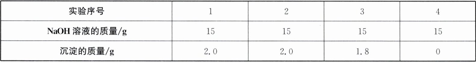 16. (5 分)现有一包氯化镁与氯化钡的混合固体$20\mathrm{g}$,为测定其组成,小明先将该混合固体全部溶于水,形成混合溶液;再将$60\mathrm{g}\ NaOH$溶液平均分 4 次加入该混合溶液中,每次充分反应后过滤,所得沉淀的质量与加入$NaOH$溶液的质量的关系如表所示。 请回答: