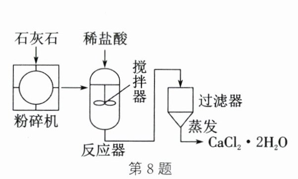 8. 食品加工、制药等领域广泛使用二水合氯化钙($\mathrm{CaCl_2·2H_2O}$)。工业上生产$\mathrm{CaCl_2·2H_2O}$的主要流程如图所示,下列说法正确的是 (