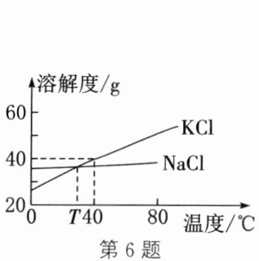 答案:6. B 解析:比较溶解度大小必须在同一温度下,没有指明温度,无法比较溶解度大小,A错误;$T\ ^{\circ}C$时,KCl和NaCl的溶解度曲线交于一点,说明该温度下两种物质的溶解度相等,B正确;$40\ ^{\circ}C$时,KCl的溶解度为40g,此温度下KCl饱和溶液的溶质质量分数为$\frac{40\ g}{100\ g + 40\ g} × 100\% \approx 28.6\%$,C错误;$80\ ^{\circ}C$时,KCl不饱和溶液降温达到饱和状态后,再降温会有晶体析出,D错误。