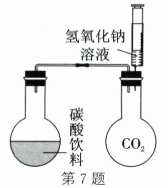 答案:7. D 解析:推入氢氧化钠溶液并振荡后,氢氧化钠与二氧化碳反应生成碳酸钠和水,气体减少,压强减小,气体的溶解度减小,碳酸饮料中溶解的二氧化碳逸出,会观察到出现大量气泡,A正确;氢氧化钠溶液与氯化氢发生反应,生成氯化钠和水,也会使压强减小,会出现同样的实验现象,B正确;压强越小,气体的溶解度越小,该装置可证明气体的溶解度受压强的影响,C正确;氨水也是一种碱溶液,能与二氧化碳反应,同样能使装置中的压强减小,实验能成功,D错误。