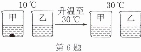 6. 将等质量的甲、乙两种物质分别加入盛有100 g水的烧杯中,充分搅拌后静置片刻,再升温至$30^{\circ}C$,现象如图所示。下列说法中,正确的是 (