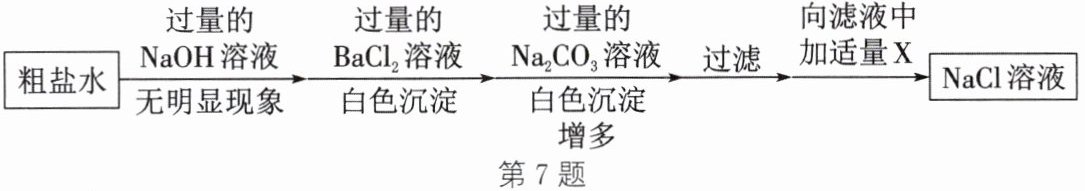 7. 某粗盐水中可能含有少量的 $ CaCl_2$、$ MgCl_2$、$ Na_2 SO_4$ 中的一种或几种杂质, 为了检验该粗盐水中含有的杂质并将其除去, 设计了如图流程。