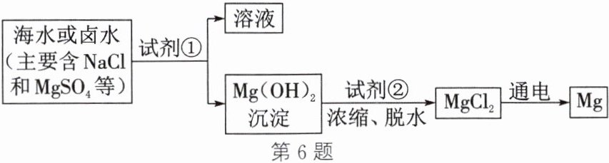6. (2024 · 宿迁沭阳期末) 镁及其合金是用途广泛的金属材料, 大量的金属镁是从海水或卤水中提取的, 其主要步骤如图所示: