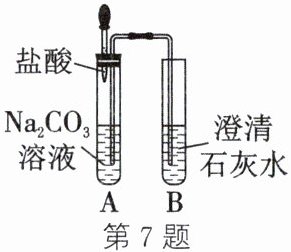 (填化学式)。答案:7.(1)$ Na_2 CO_3 + 2 HCl = 2 NaCl + H_2 O + CO_2\uparrow$ (2)盐酸与碳酸钠反应生成了二氧化碳气体,试管内气体增多,压强增大,将A中的溶液压入B中 (3)$ CaCO_3$