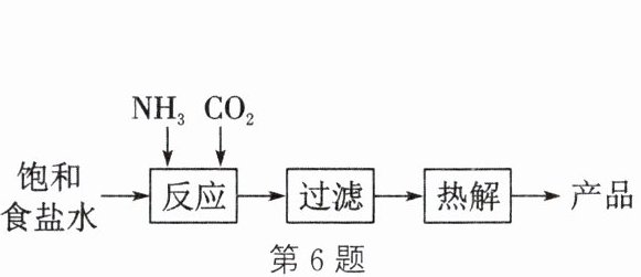 6. 已知向饱和食盐水中通人氨气得到饱和氨盐水,饱和氨盐水能与$\mathrm{CO_2}$发生反应:$\mathrm{NaCl+NH_3+CO_2+H_2O=NaHCO_3+NH_4Cl}$。某学习小组同学以饱和食盐水等为原料制备纯碱的主要流程如图。