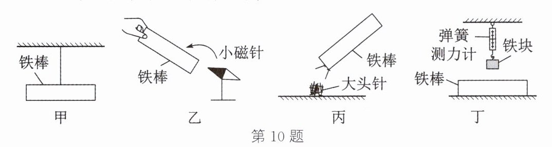 10. 为了判断一根铁棒是否具有磁性,小明进行了如图所示的四个实验,根据实验现象不能判断该铁棒一定有磁性的是 (