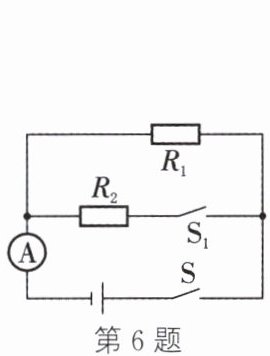 6. 在如图所示的电路中,电源电压保持不变。只闭合开关$S$,电流表的示数为$0.2\ A$,再闭合开关$S_1$,电流表的示数变化了$0.3\ A$。那么闭合$S$、$S_1$后,在相同的时间内,电流通过$R_1$、$R_2$所做的功之比是