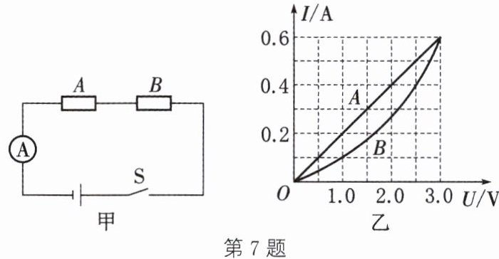 7. 有两个电路元件$A$、$B$,把它们串联在电路中,如图甲所示,通过元件的电流与其两端的电压关系如图乙所示。闭合开关$S$,这时电流表的示数为$0.4\ A$,则在相同时间内$A$、$B$两元件消耗的电功之比为