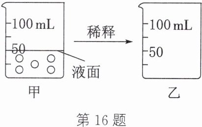 16. (模型建构)化学中普遍存在着“系统与模型”。建立模型是解决系统问题的常用方法。如图甲所示为50mL溶质质量分数为10%的蔗糖溶液模型,其中5个“○”代表所有的蔗糖分子。往该溶液中加水使其溶质质量分数变为5%,稀释后溶液密度变小。在图乙中,画出稀释后的蔗糖溶液模型(要求画出液面和蔗糖分子分布)。