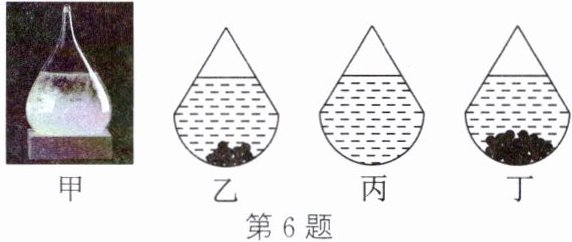 6. 如图甲所示是一种简易的天气预报瓶,瓶内装有一定量的水和硝酸钾晶体,可根据瓶内晶体析出量来判断气温的大致变化。将瓶子放置在20℃的环境下,出现的现象如图乙所示,随着外界温度的变化,也会出现如图丙、图丁所示的现象。下列判断正确的是(