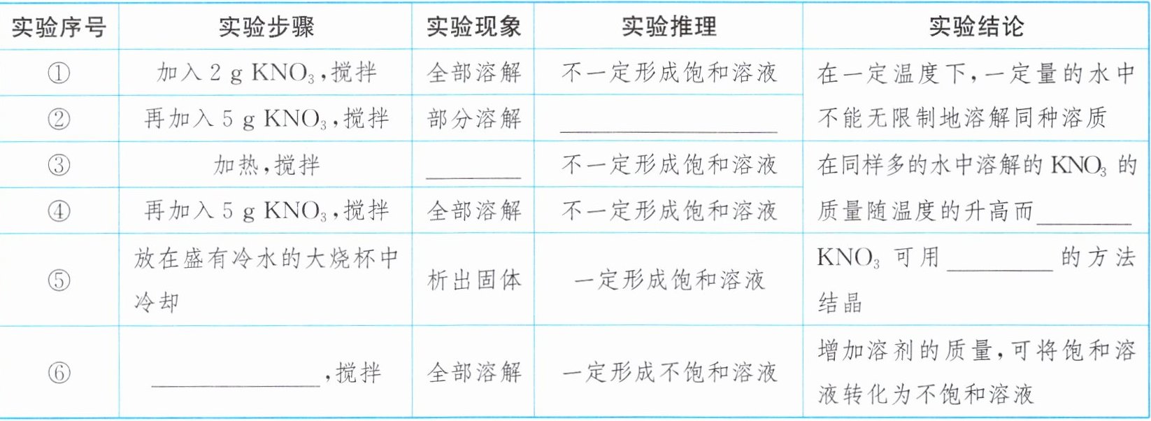 (填序号)中观察到的实验现象,经分析推理,可得出将KNO₃饱和溶液转化为不饱和溶液的另一种方法,即升高饱和溶液的温度。答案:4.【实验探究】一定形成饱和溶液 全部溶解 增大 降温结晶 加入过量的水 【实验反思】(1)④ (2)②③